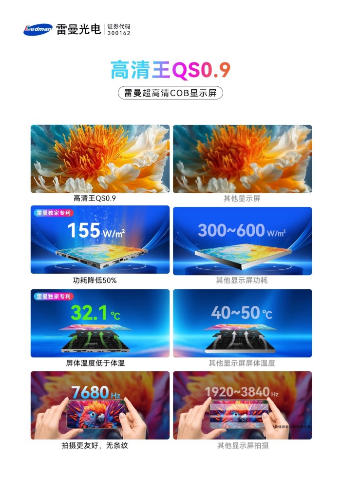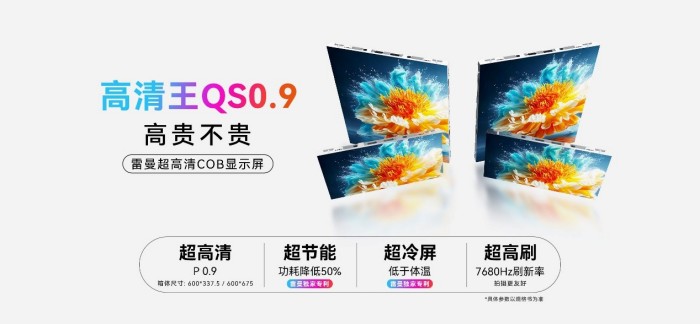 此次推出的下一代高清王 COB 系列产品(主推型号 QS0.9),正是雷曼光电技术创新成果的集中落地载体。这款汇集十多项前沿技术的产品,既是对8年COB技术积累的总结,更是对“技术引领”理念的延续:0.9mm间距适配超高清需求,50%节能践行绿色理念,低体温运行延长产品寿命…… 每一项优势,都彰显着雷曼光电20年如一日的技术坚守,也让行业看到“长期主义” 在技术创新中的力量。