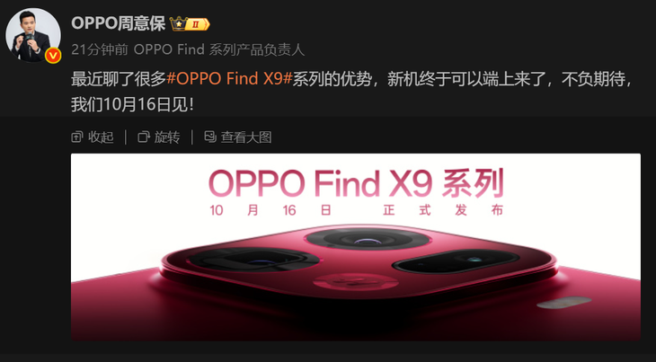 OPPO今日正式宣布,Find X9系列将于10月16日发布。从官方预告海报中可以看到,这次Find X9系列采用了十分引人注目的酒红色配色,这一亮眼色彩在手机市场中多年未见。同时,镜头模组的设计也回归了矩形形态,并在边缘进行了圆润过渡处理,展现出一种既现代又优雅的美学。