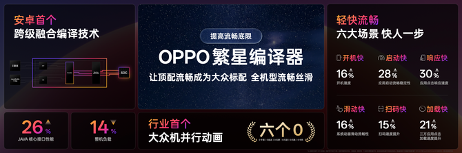 OPPO ColorOS系统软件研发中心总经理周海涛更关键的是,繁星编译器打通了上层和底层的编译能力,让ColorOS 16具备了最前沿的编译能力,真正的实现了跨级融合编译的技术突破,让底层和上层代码能够进行统一编译优化。在繁星编译器的优化下,安卓Java核心接口性能提升了26%,整体负载降低14%。更重要的是,繁星编译器驱动编译算法效率提升,让没有顶配处理器的大众机,也能有“0卡顿、0延迟、0闪屏、0闪退、0闪跳、0卡死”的“六个0”流畅体验,让机圈德芙,既是顶配,也是标配。