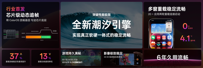 OPPO ColorOS平台软件研发总监孙中兰对比传统方案,搭载了芯片级动态追帧技术的ColorOS 16能够做到更精细的功耗管理,任务完成后还能及时回收多余算力,减少功耗浪费。在实测中,系统在重载场景下的流畅稳定性提升了37%,功耗对应降低了13%。在芯片级动态追帧技术的赋能下,ColorOS 16的流畅性得以最大程度释放和展现,真正实现了从硬件到软件的全面流畅体验。除了重载,全新潮汐引擎还升级了久用技术,系统久用6年也能持久流畅,实现重载和久用双极限场景的双重流畅。
