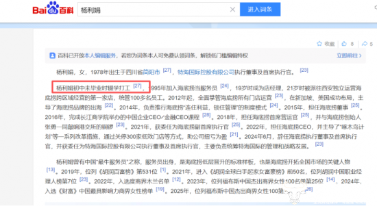 1995年,17岁的杨利娟加入成立仅一年的海底捞,成为门店服务员,19岁时成为店经理,21岁时被派往西安独立运营海底捞跨区域经营的第一家店,统管100多名员工。