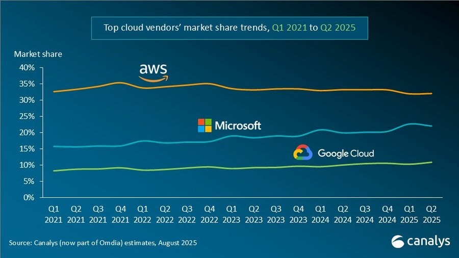 Microsoft Azure和Google Cloud在2025年第二季度的增幅显著超过30%,而市场领导者AWS的同比增长率为17%,与上一季度持平。