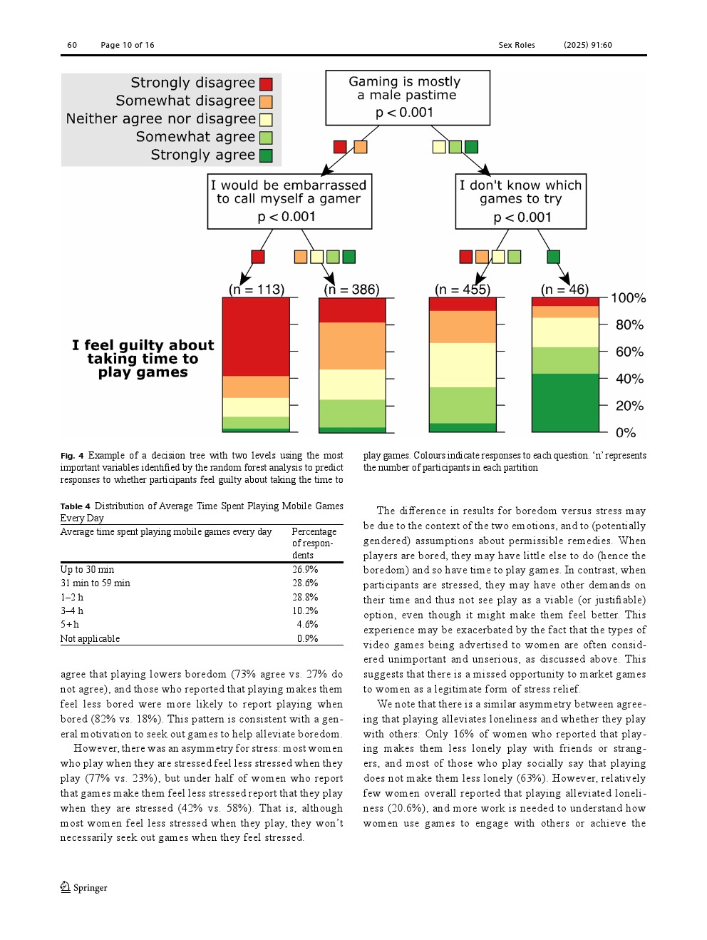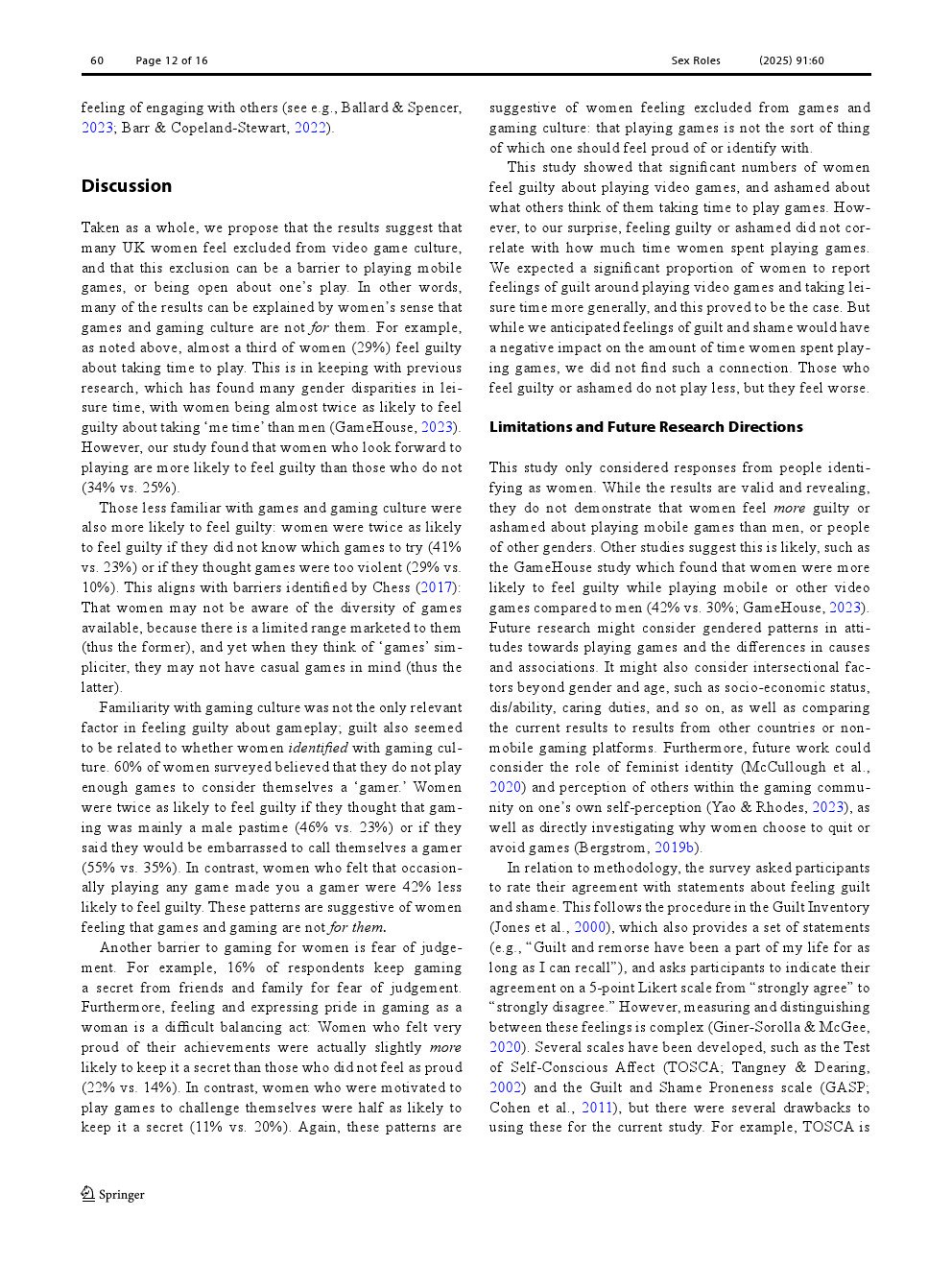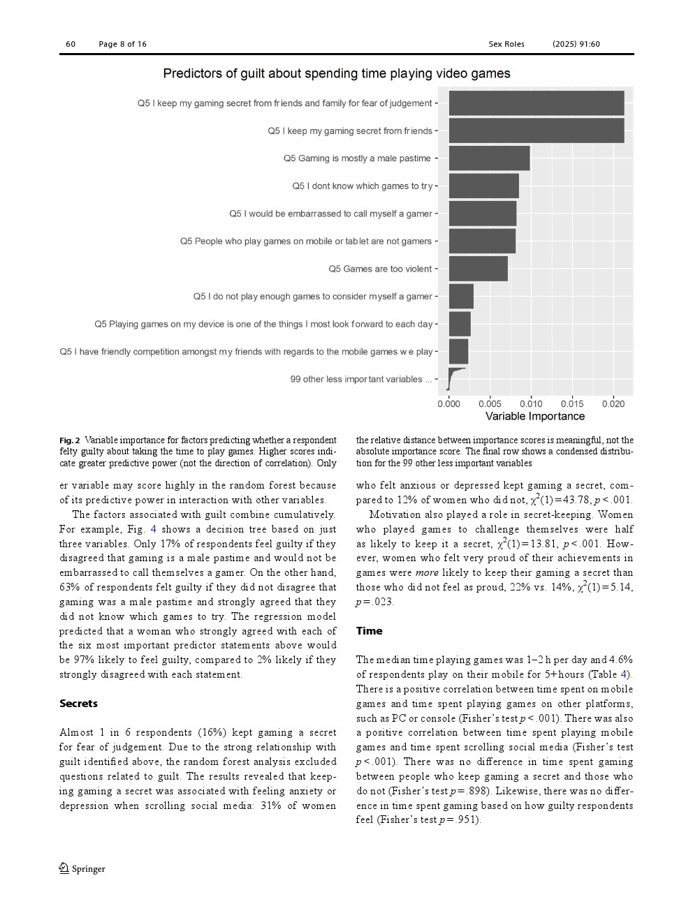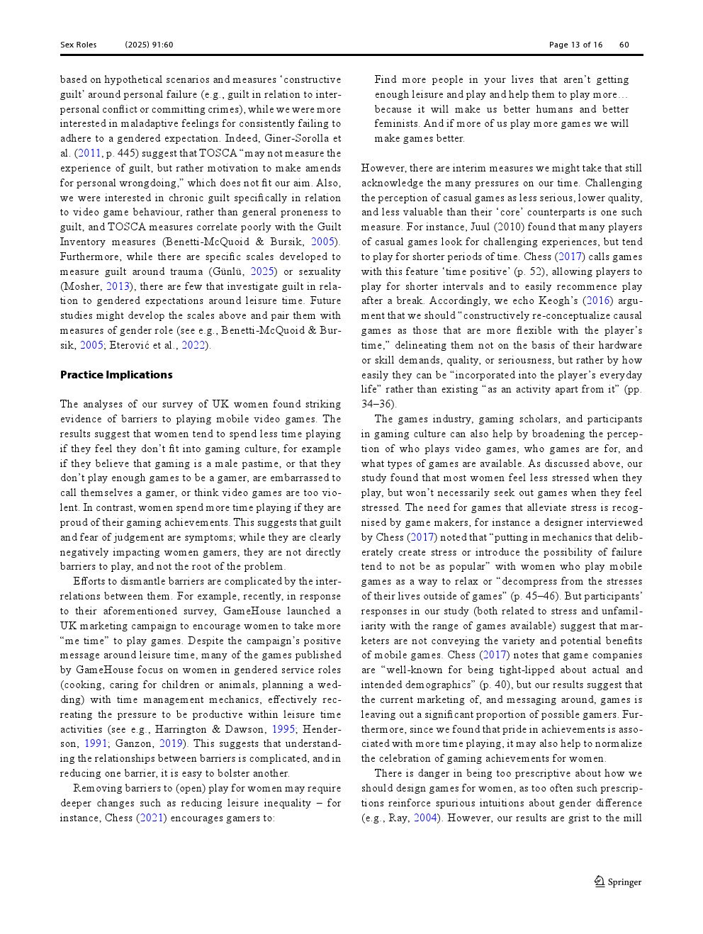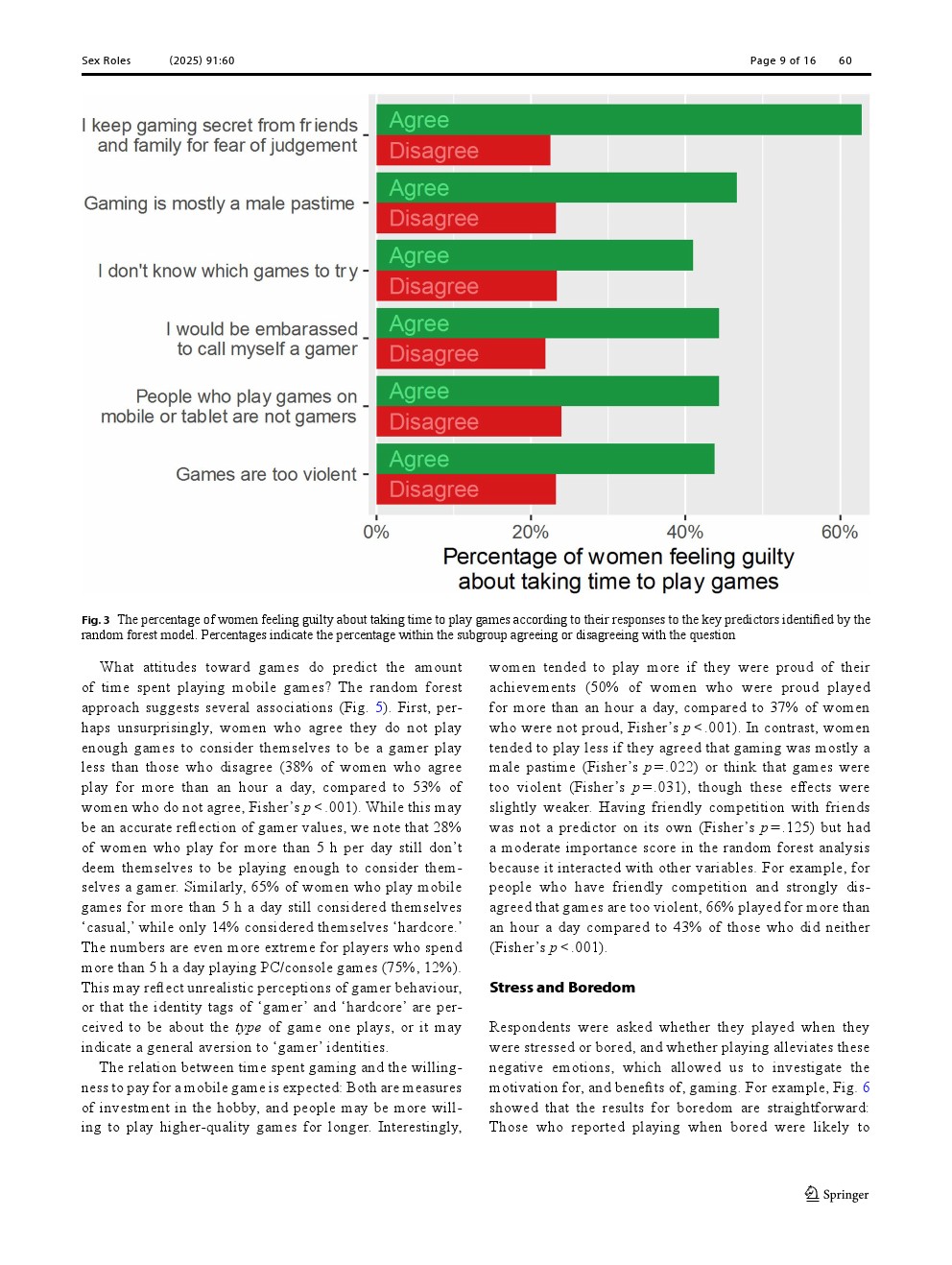 研究显示,28%的受访女性认同自己会对抽时间玩游戏产生愧疚感,年长玩家(55岁以上)的羞耻感低于年轻玩家(16至24岁)。对亲友隐瞒游戏喜好的女性产生愧疚感的可能性是坦诚者的三倍(63% vs 23%),而期待游戏时间的女性比无感者更易愧疚(34% vs 25%)。