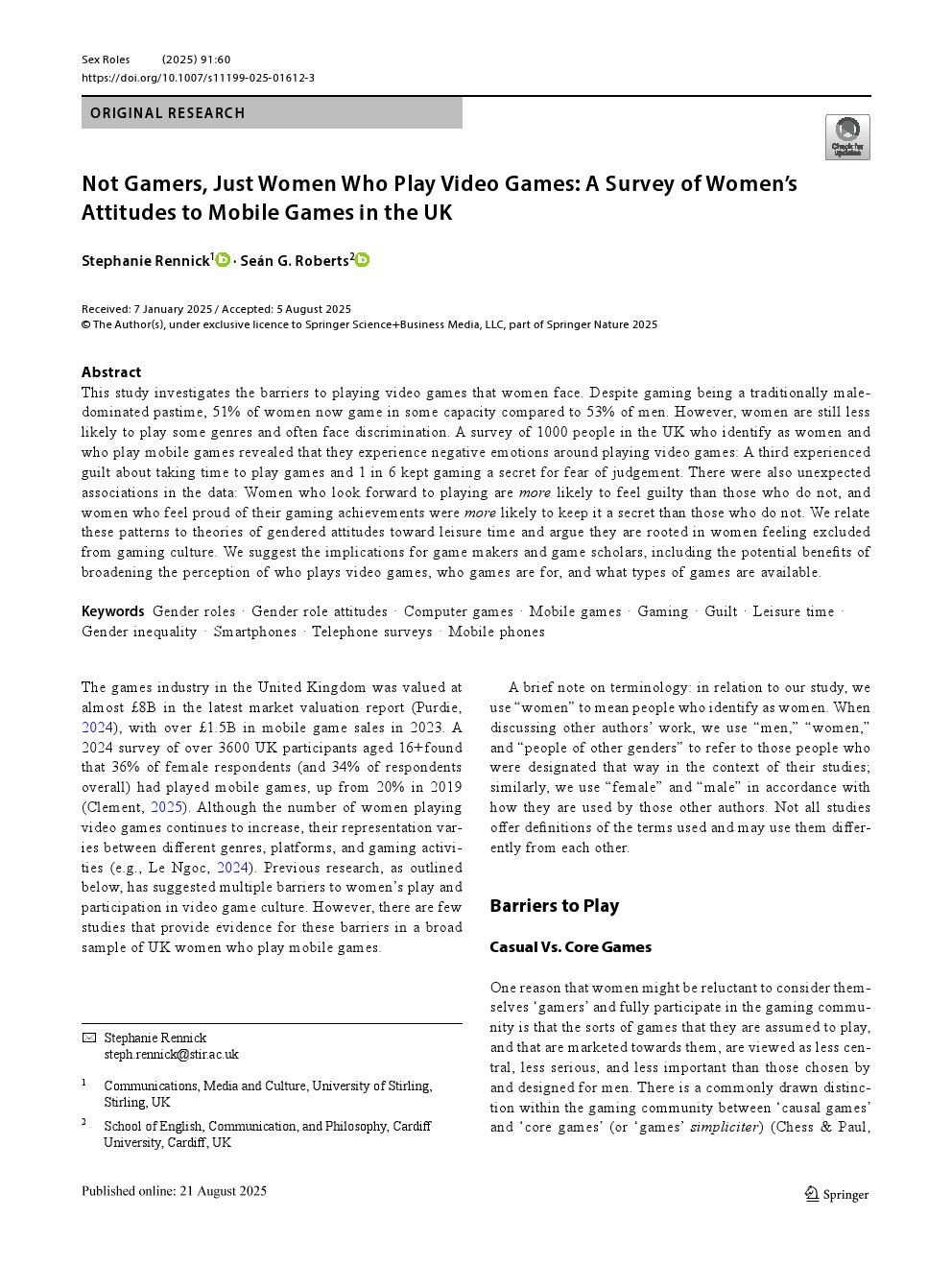 报告特别说明本研究仅采集自女性受访者,结果虽具有揭示性但并不能证明女性比其他性别更易产生愧疚感。总体而言,许多英国女性感觉被排除在视频游戏文化之外,这种排斥感可能成为玩手机游戏或公开游戏喜好的障碍——换言之,多数结果可解释为女性认为游戏及游戏文化不属于自己。
