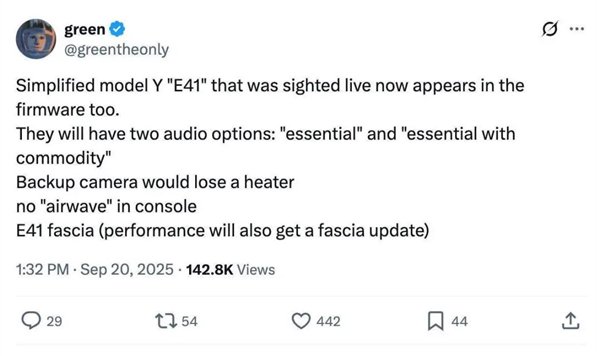 据悉,一位知名黑客从特斯拉的官方固件里,挖出了一份车型代号为E41的详细减配清单,而这款车直指廉价版Model Y。