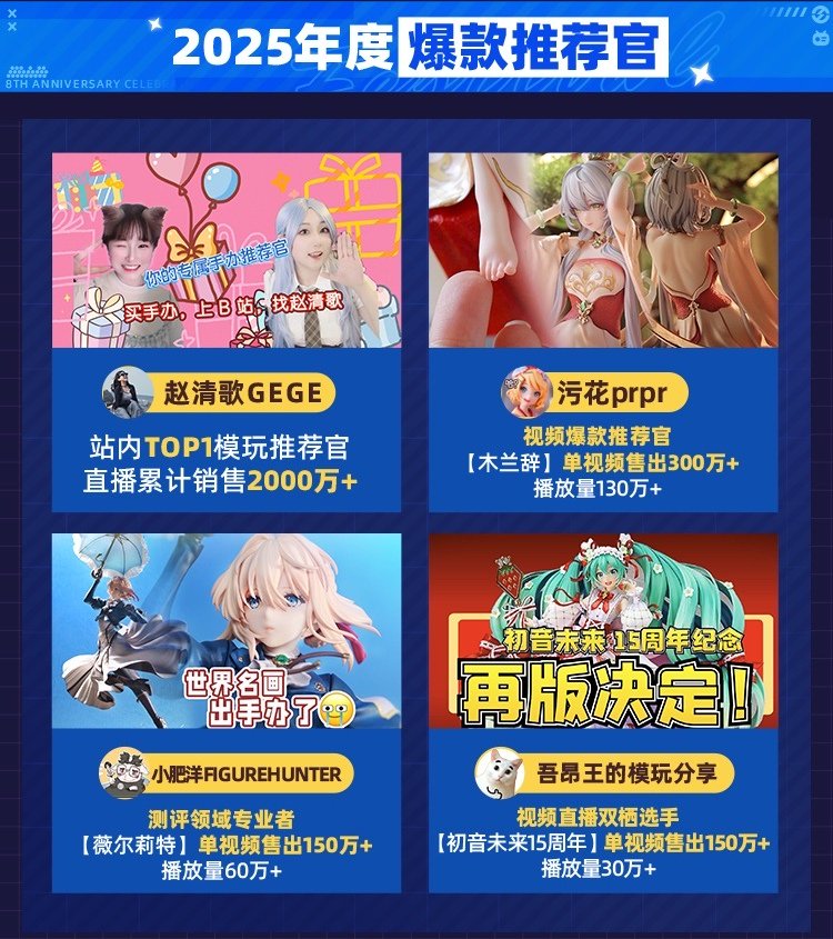 B站会员购运营团队指出,会员购的带货逻辑在于通过情感联结和细致的产品讲解,激发用户兴趣,从而实现高效转化。例如,UP主“赵清歌GEGE”虽粉丝量不大,但凭借出色的私域运营能力,单场直播GMV突破60万元,年销售额可达2000万至3000万元。“污花prpr”在一场直播中售出7000件手办,单个视频GMV达300万元;“小肥洋FigureHunter”则实现销量4800件,GMV超150万元。这些UP主均为粉丝数不足100万的中腰部创作者。
