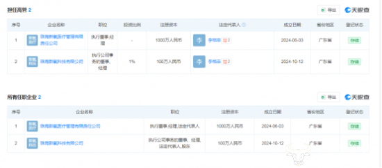 李格菲,出生于1995年,今年30岁,在新氧高管层中是最为年轻的一位。目前关于李格菲的公开信息非常少。在天眼查中用“李格菲”为关键词进行检索。可以看到她在珠海新氧医疗管理有限责任公司和珠海新氧科技有限公司任法定代表人及总经理。而这两家都是新氧的运营实体也就是北京新氧科技有限公司的全资子公司。
