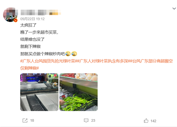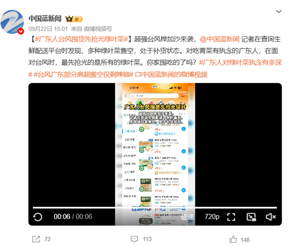 对吃青菜有执念的广东人,在面对台风时,最先抢光的是所有的绿叶菜。有媒体在查询生鲜配送平台时发现,多种绿叶菜售空,处于补货状态。