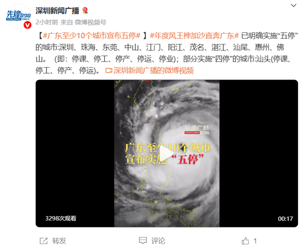 9月22日,广东多地发布通知:台风来袭期间实行“五停”措施(即:停课、停工、停产、停运、停业)。