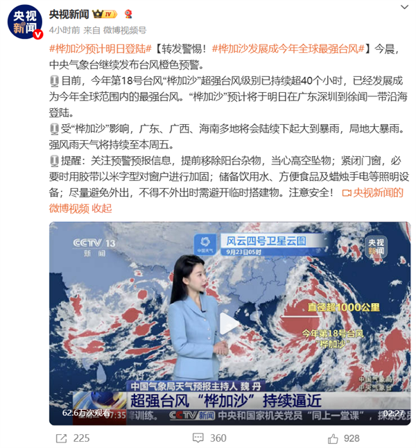 9月23日消息,今年第18号台风“桦加沙”(超强台风级)来袭,广东多地开始实行五停。