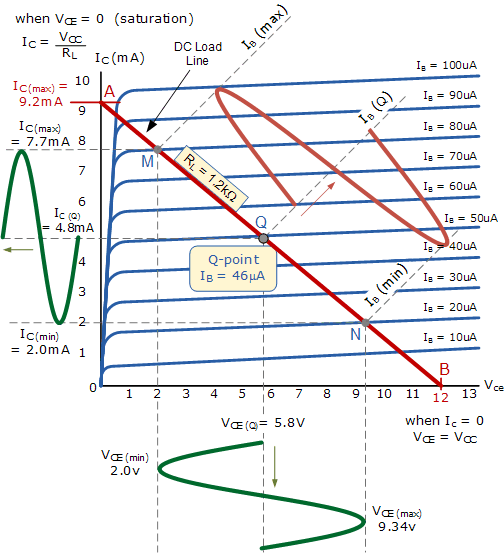 负载线上的 Q 点对应基极电流的静态值(I_b = 45.8μA)(或 46μA)。接下来需确定基极电流的最大和最小峰值摆幅 —— 这两个摆幅需能使集电极电流(I_c)产生相应变化,且不会导致输出信号失真。