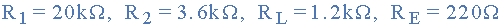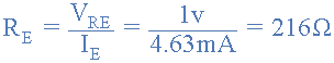 电阻(R_E)连接在晶体管的发射极与地之间,前文已说明其两端的电压降为 1V。因此,发射极电阻(R_E)的阻值可计算为: