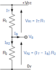 总电阻(R_T)等于(R_1 + R_2),因此流经分压网络的电流(i = frac{V_{cc}}{R_T})。电阻(R_1)和(R_2)连接点产生的电压,会将基极电压((V_b))稳定在低于电源电压的某个值。