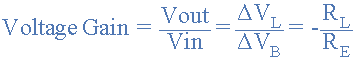 共射极放大器的电压放大倍数,等于输入电压变化量与放大器输出电压变化量的比值,即(Delta V_L)(对应(V_{out}))与(Delta V_B)(对应(V_{in}))的比值。此外,电压放大倍数也等于集电极回路中的信号电阻与发射极回路中的信号电阻的比值,公式如下: