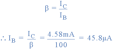 由于晶体管的集电极电流(I_c)也等于晶体管的直流放大系数(β)与基极电流((I_b))的乘积(即(β times I_b)),假设晶体管的 β 值为 100(小功率信号晶体管的合理平均值),则流入晶体管的基极电流(I_b)可计算为: