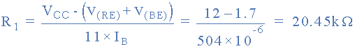 实际应用中,通常不会使用独立的基极偏置电源,而是通过一个降压电阻(R_1),从主电源轨((V_{cc}))为基极提供偏置电压。选择电阻(R_1)和(R_2)的阻值,可使静态基极电流达到 45.8μA(或四舍五入为 46μA)。