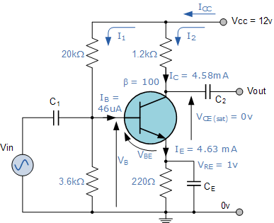 静态基极电压((V_b))由两个电阻(R_1)、(R_2)和电源电压(V_{cc})构成的分压网络决定(电流会流经这两个电阻)。