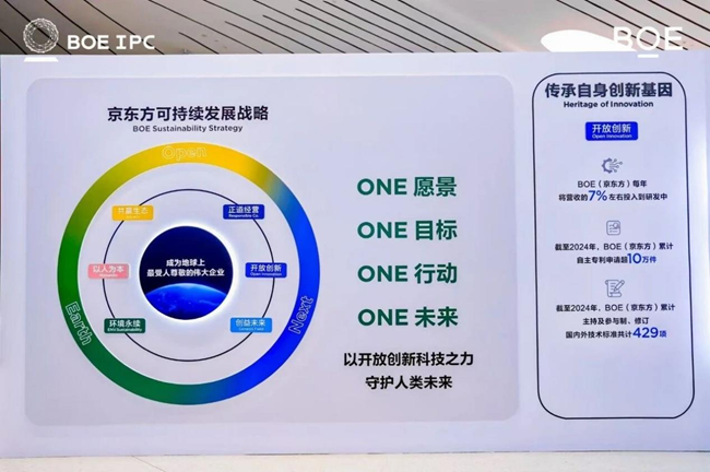 BOE(京东方)不仅将可持续发展理念融入自身的企业发展基因,还坚持生态协作,在全球范围内推动可持续发展的落地实践。今年4月,BOE(京东方)正式发布中国显示行业首个可持续发展品牌“ONE”(Open Next Earth),以“开放包容(Open)、创新引领(Next)、永续生态(Earth)”为三大品牌内涵,致力于构建一个以“开放创新”为基因、以可持续价值创造为目标的有机体系。与此同时,在今年9月举办的京东方全球创新伙伴大会2025上,BOE(京东方)重磅发布了集团可持续发展战略,建立“开放创新、环境永续、共赢生态、以人为本、正道经营、创益未来”六大战略支柱,让可持续发展成为BOE(京东方)的核心竞争力和“第N曲线”新增长极,为中国科技企业在未来全球化浪潮中践行ESG理念提供了标杆示范。