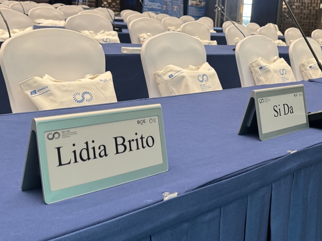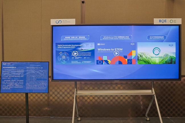 作为一家领先的物联网创新企业,BOE(京东方)自创立之初一直以科学造福人类,这与《2024-2033年科学促进可持续发展国际十年》倡议(简称“科学十年”倡议)所倡导的“利用全球科学力量,共同打造一个可持续未来”的方向高度契合。在“科学十年”框架内,BOE(京东方)与UNESCO汇聚多方力量,于2025年共同发起“Windows to STEM”倡议,以“科学普及与教育”为切入点,向非洲地区引入先进数字化教学设备,并选定一批核心培训师进行集中培训,聚焦非洲STEM教育能力建设。STEM教育是科学(Science)、技术(Technology)、工程(Engineering)和数学(Mathematics)的综合教育模式,旨在培养学生的创新能力和实践能力。今年8月,首届“Windows to STEM”教师培训工作坊已在肯尼亚内罗毕成功举办,BOE(京东方)将智慧教育设备与课程资源带入非洲,助力当地教师开展编码与AI教学,以科技打破教育壁垒,以可持续的方式培育本土师资,共建开放的全球教育资源平台。值得关注的是,2025年是BOE(京东方)与UNESCO基于“科学十年”倡议开启合作的首年,年底还将与UNESCO、中国科学技术协会、肯尼亚教育部等伙伴共同举办项目启动仪式,并以试点成果为基础,将“Windows to STEM”推广至更广阔的非洲地区。而在“科学十年”分会现场,BOE(京东方)本着“科技办会”和“绿色办会”原则,通过创新的多触点“万境屏”全面展现了联合国“科学十年”项目介绍、肯尼亚教师培训工作坊的教学成果,以及BOE(京东方)刚刚发布的可持续发展品牌“ONE”等相关视频,给与会者提供更为直观的感受。不仅如此,此次边会的桌签也替换成了BOE(京东方)智慧电子桌牌,倡导实现“无纸化”绿色低碳理念。
