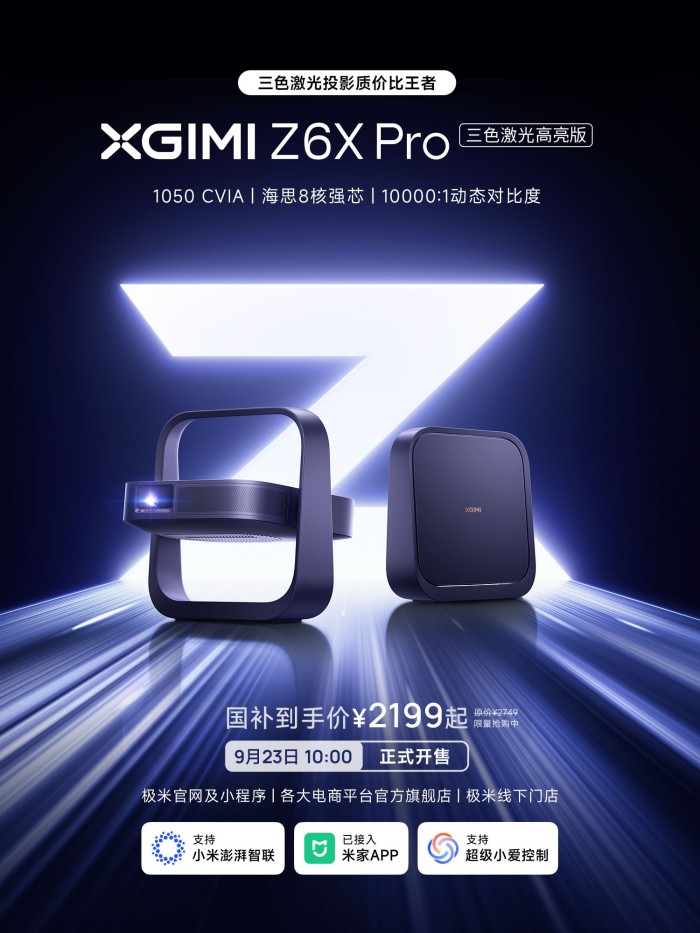 作为Z系列首款三色激光产品,极米 Z6X Pro 三色激光高亮版在性能与外观上都实现了显著提升。其亮度高达1050CVIA,两千元价位段亮度破千,大幅减少对环境光线的依赖,客厅到卧室,想投就投。极米 Z6X Pro 三色激光高亮版搭载海思八核处理器,强大算力保障设备在高清影片播放、多任务处理等场景下的流畅运行。同时,它也接入了米家生态系统,智能操控更加便捷。新品首发价2749元,国补后价格为2199元,以高配低价重新定义“质价比卷王”。