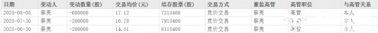不过除了薪酬收入,蔡亮还通过股份减持获得了不菲的收入。据悉,他于今年6月30日、7月30日和8月5日通过竞价交易方式累计减持100万股,套现约1653万元。减持后,其持股数量为731.5万股。