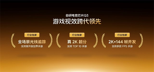 自研电竞芯片 Q3 现已适配 180+ 款 PC 级游戏超分、180+ 款 PC 级游戏超帧和 7 款头部游戏超分超帧,并携手 10大 Top 级游戏迈入真 2K 视效时代、4 大顶流 FPS 游戏带来领先枪战体验,并成功落地全场景自研光线追踪技术。