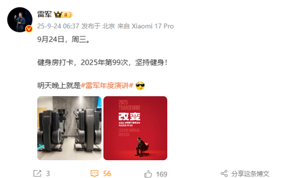 快科技9月24日消息,今天早上6:37,小米CEO雷军在社交平台晒出健身房打卡照,这是他今年第99次健身。