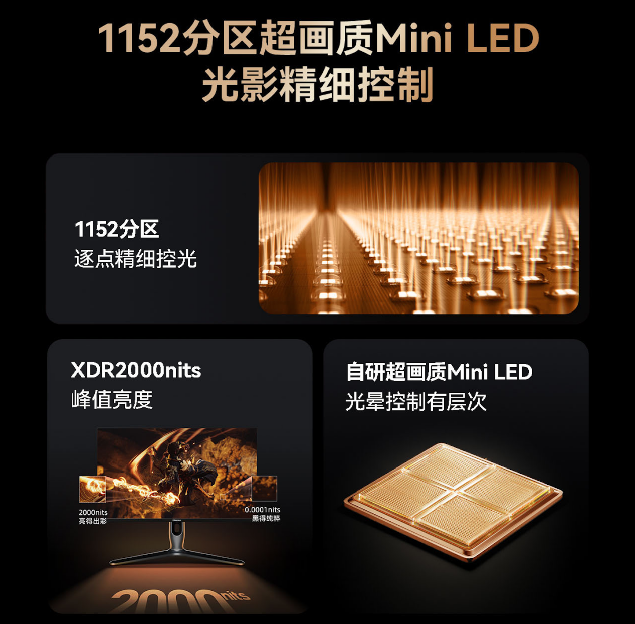 除了抗反光技术外,另一项决定3A游戏画面表现的关键因素在于显示器的控光能力。海信G7 Ultra显示器采用1152分区超画质Mini LED背光屏幕,内置多分区多控光的AM驱动芯片,峰值亮度可达2000nits,使游戏画面的明暗对比鲜明,达到暗部细节清晰、高亮不过曝的画质效果。此外,海信还将万元Mini LED电视同源的光晕控制系统融入G7 Ultra,有效改善Mini LED显示器普遍存在的光晕控制“短板”。
