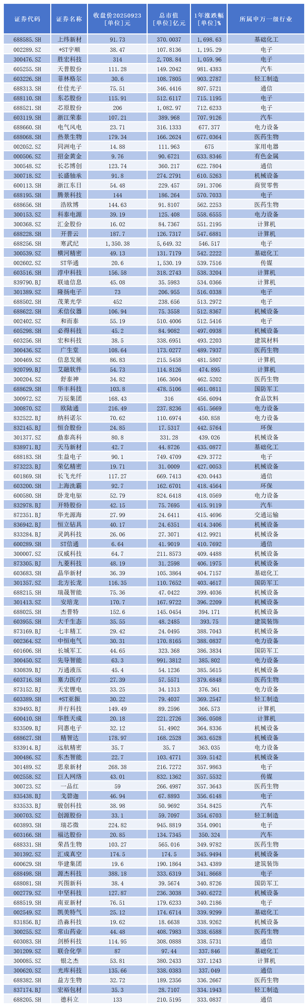 上纬新材(688585.SH)、*ST宇顺(002289.SZ)、胜宏科技(300476.SZ)、天普股份(605255.SH)、菲林格尔(603226.SH)、仕佳光子(688313.SH)、东芯股份(688110.SH)、芯原股份(688521.SH)、浙江荣泰(603119.SH)、电气风电(688660.SH)、热景生物(688068.SH)、同洲电子(002052.SZ)、招金黄金(000506.SZ)、长芯博创(300548.SZ)、长盛轴承(300718.SZ)、浙江东日(600113.SH)、腾景科技(688195.SH)、浩欧博(688656.SH)、科泰电源(300153.SZ)、汇金股份(300368.SZ)、开普云(688228.SH)、寒武纪(688256.SH)、横河精密(300539.SZ)、ST华通(002602.SZ)、淳中科技(603516.SH)、联迪信息(839790.BJ)、隆扬电子(301389.SZ)、茂莱光学(688502.SH)、禾信仪器(688622.SH)、和而泰(002402.SZ)。