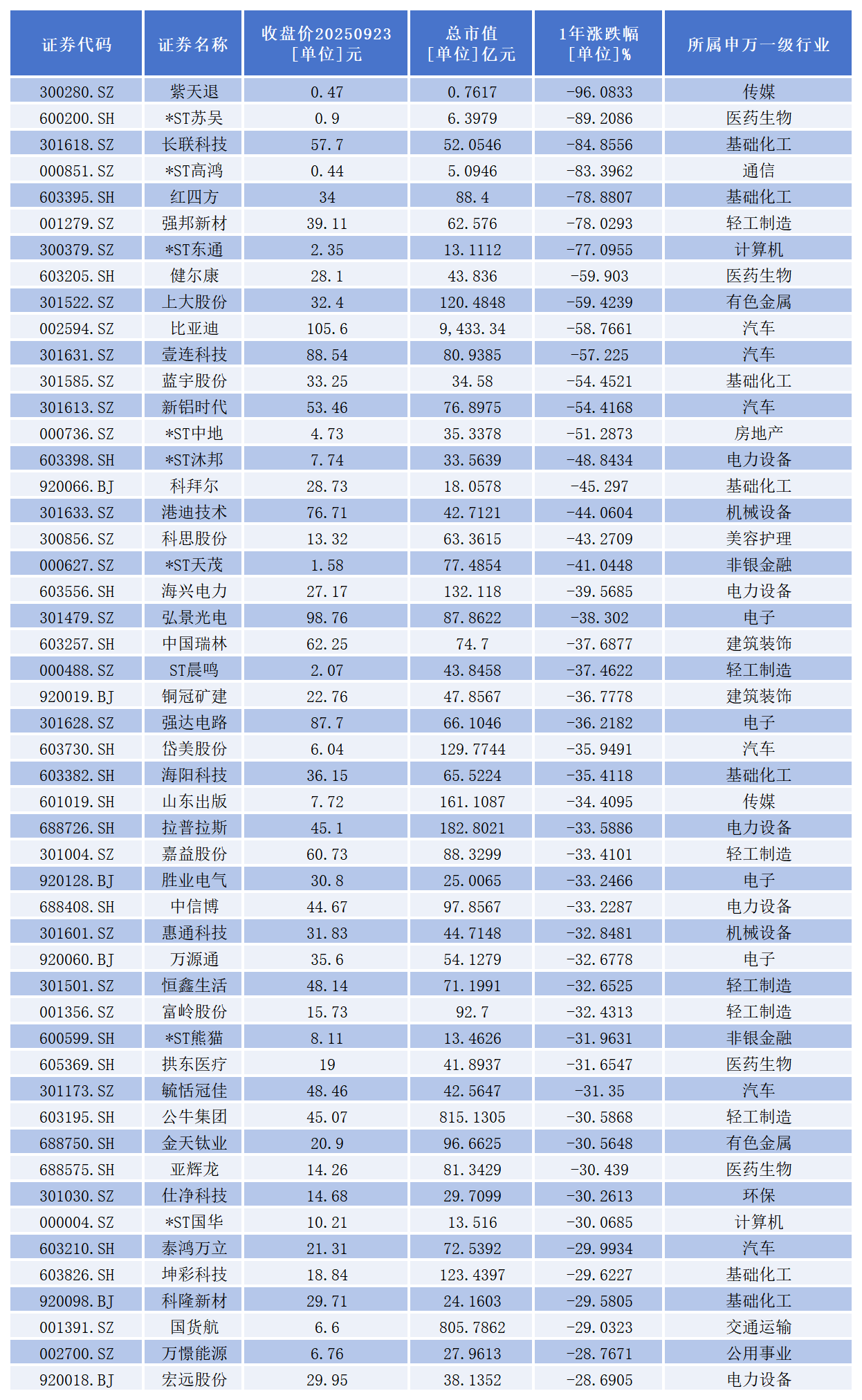 同花顺数据显示,截至9月23日收盘,近一年,A股共有346家上市公司股价出现下跌。