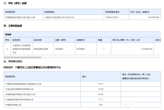 最终宁夏电信凭借83.68分排名第一;固原联通排名第二,得分79.77分;宁夏晟驰节能环保科技有限公司排名第三,得分77.7分;中移建设有限公司排名第四,得分76.9分;宁夏众创空间教育科技有限公司排名第五,得分75.68分。这意味着宁夏电信得偿所愿,成为了该项目的最终中标人!