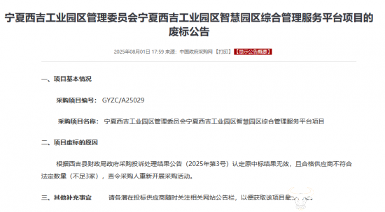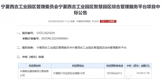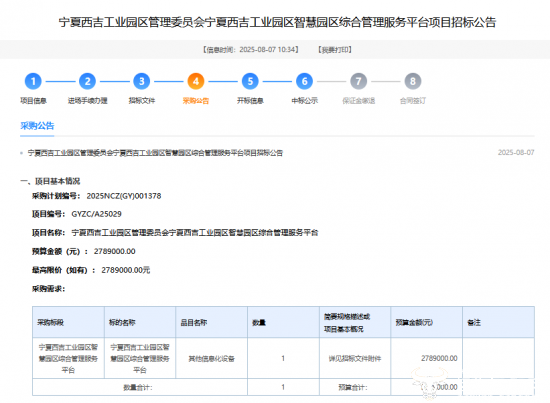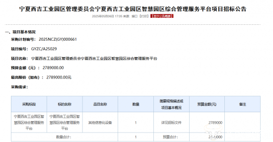 首先了解一下项目全称。项目名为“宁夏西吉工业园区管理委员会宁夏西吉工业园区智慧园区综合管理服务平台”,于5月6日启动招标,预算金额并不算高,为278.9万元。