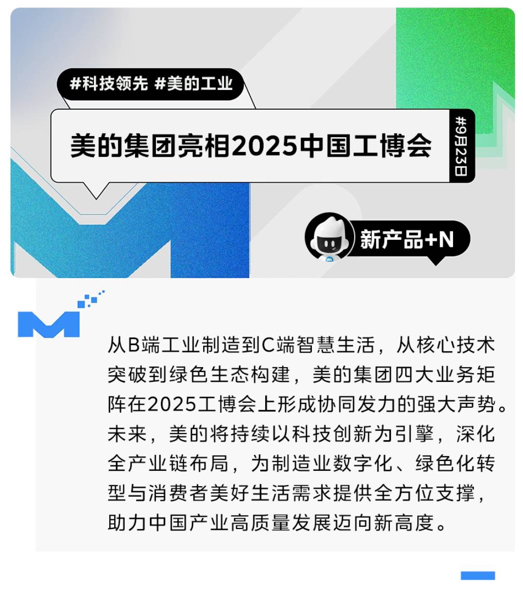 从B端工业制造到C端智慧生活,从核心技术突破到绿色生态构建,美的集团四大业务矩阵在2025工博会上形成协同发力的强大声势。未来,美的将持续以科技创新为引擎,深化全产业链布局,为制造业数字化、绿色化转型与消费者美好生活需求提供全方位支撑,助力中国产业高质量发展迈向新高度。