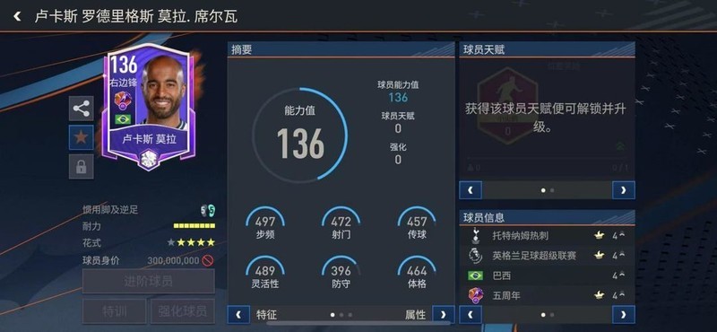 小卢卡斯在数据方面表现出色,总评达到136。他拥有497的双速和489的灵活性,使他在盘带和突破时非常灵活流畅。472的射门数据保证了他出色的得分能力,而457的传球评分也让他具备很强的助攻实力。