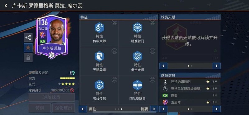 小卢卡斯拥有六项顶级特性,其中包括传中大师和弧线传球,使他的大范围转移和传中更为精准,特别适合下底传中;此外,精准射门特性也显著提升了他的进攻威胁。