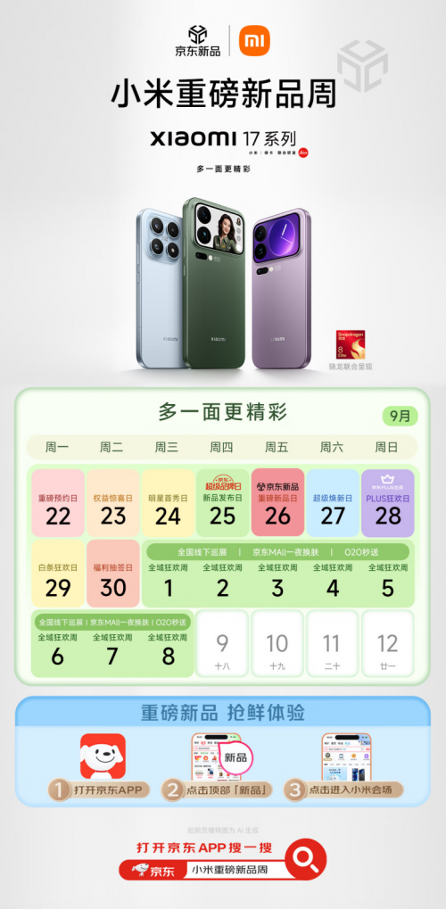 为进一步满足消费者新品国补换新需求,给予用户更多“抢鲜”权益,京东携手小米等3C数码厂商、运营商及回收企业,发起“京东先人一步加速换新计划”——消费者在京东下单3C数码新品可享国家补贴叠加以旧换新补贴、京补合约等多重补贴福利。同时,在新品服务权益加码的基础上,消费者还可享受“权益随心选”这一全新购新方式,获得更加自由灵活的换机体验。想要入手小米17系列,那就来京东预约,发布会后先人一步下单吧。