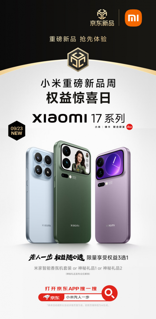 9月25日,小米17系列将正式发布,引发广大消费者关注。为带给消费者更多权益,京东携手小米打造先人一步加速换新计划,下单可享限量权益随心选,包括米家智能香氛机套装和2件神秘礼品,三项权益可任选其一。即日起,消费者可到京东预约新机,方便发布会后第一时间下单。