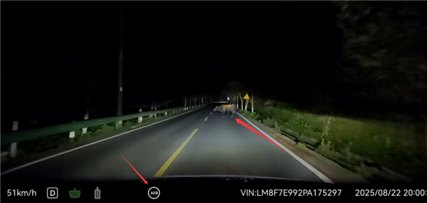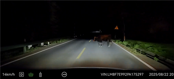 在转过一个弯后,车辆突然发出警示音,同时AEB介入减速制动,之所以如此,是因为前方行进的路上竟然出现了一头牛。