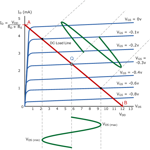 Q 点的位置通常设置在负载线的中点,以便实现 A 类放大。由于 JFET 是耗尽型器件,因此其栅极电压一般为负。与共射 BJT 电路一样,JFET 共源放大器的输出与输入相差 180° 相位。