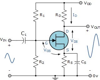 该放大电路由一个 N 沟道 JFET 组成,但也可以用等效的 N 沟道耗尽型 MOSFET 来替代,因为电路图完全一样,只是器件不同。它被连接成共源配置。JFET 的栅极电压 Vg 通过由电阻 R1 和 R2 组成的分压网络来偏置,使其工作在饱和区,这相当于 BJT 的有源区。