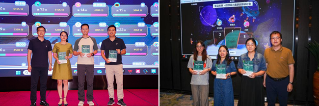活动现场还设置了趣味性的有奖问答环节,多名幸运嘉宾获得了精美奖品,气氛热烈。有好几位幸运嘉宾更收获了范建华教授亲笔签名的学术著作《微藻与合成生物学》,大家都非常开心,并与两个教授合影留念,成为研讨会上的难忘瞬间。