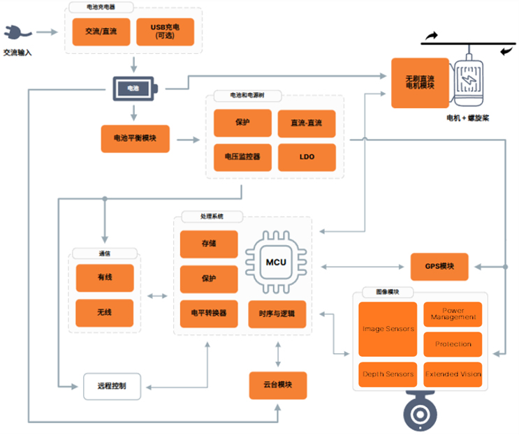 下面的框图展示了采用安森美推荐产品的工业无人机方案。 该方案集成了多种图像感知技术, 运用了安森美的全局和卷帘快门传感器系列产品。 电源管理、 通信等大多数功能块器件均可从安森美的全面方案中获取。