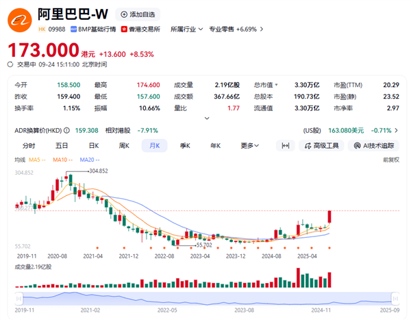 快科技9月24日消息,今天,阿里巴巴港股爆发,大涨近9%,最新市值来到3.3万亿港元,续创4年来新高。