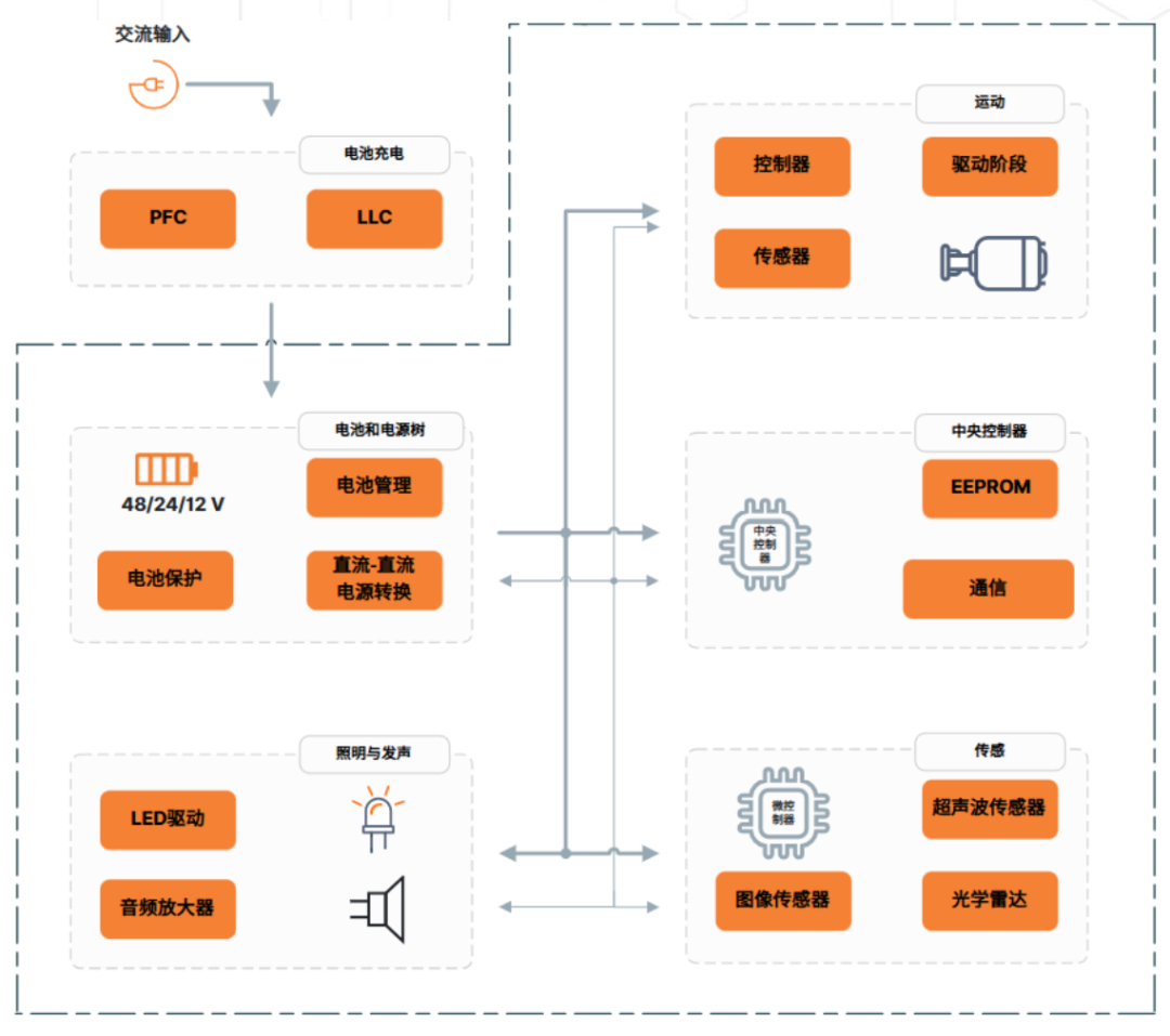 下面的框图展示了安森美 (onsemi)打造的智能移动机器人方案。 机器人系统由多个相互连接的子模块构成, 主要包括电池管理、 运动控制、 感测和中央处理器 (CPU) 等子模块。 这些子模块方案与具体的应用场景紧密相关:例如,仅在内部作业的机器人所需的传感器数量较少;而搭载机械臂的机器人则需要配备更多电机逆变器。