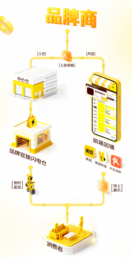 在该模式下,品牌入驻以后,需在美团和大众点评开通带有“品牌官方旗舰店”标识的前端店铺,而商品需入美团中心仓,再由中心仓配送至品牌官旗闪电仓,等待用户的即时零售订单。美团官方称,12月31日前入驻的品牌,将提供限时免仓租政策。