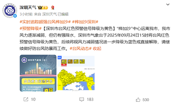 深圳市气象台24日15时将台风红色预警信号降级为黄色,后续将视风力减弱情况进一步降级为蓝色或直接解除。