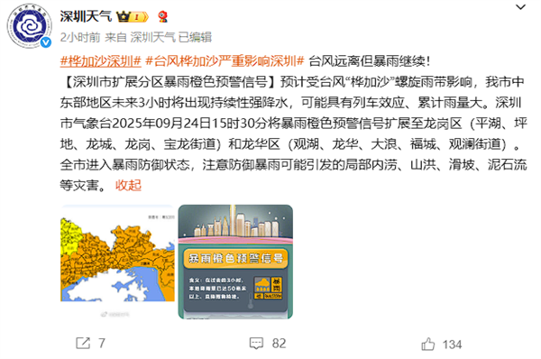 9月24日消息,据央视新闻报道,深圳市气象台24日14时25分发布: