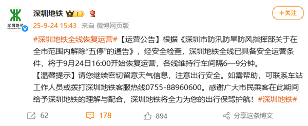 另外,深圳市防汛防旱防风指挥部通告,决定于24日16时起在全市范围内解除“五停”(停工、停业、停市、停运、停课)措施。