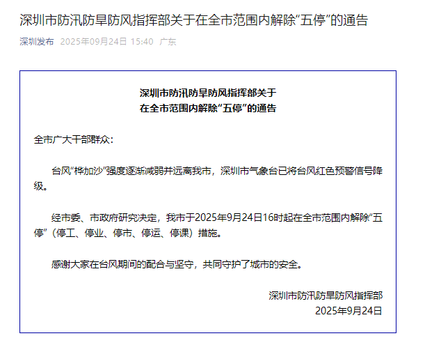 经市委、市政府研究决定,我市于2025年9月24日16时起在全市范围内解除“五停”(停工、停业、停市、停运、停课)措施。