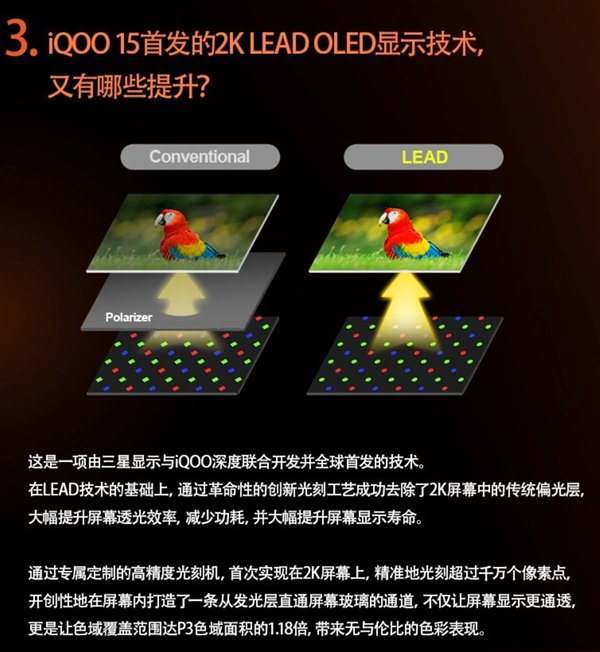 iQOO 15所搭载的这块2K三星珠峰屏,并非简单的硬件堆砌,而是三星显示与iQOO深度联合开发的创新结晶,其核心亮点在于全球首发的2K LEAD OLED显示技术。